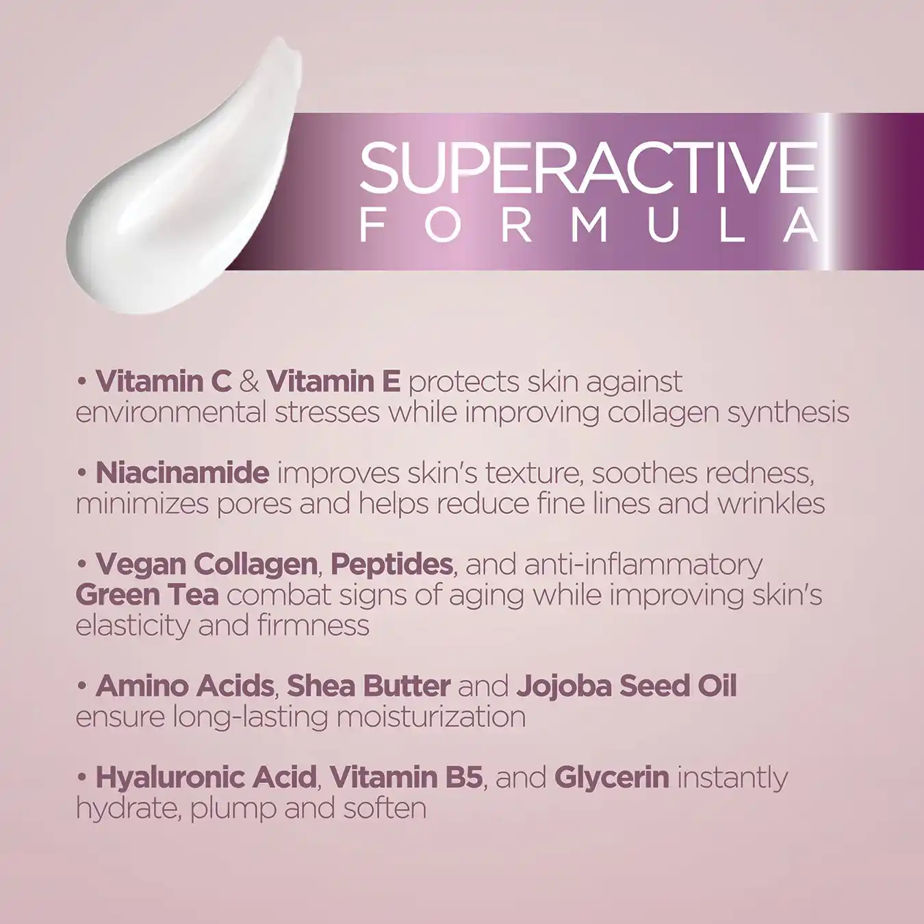 اسید هیالورونیک، ویتامین B5 و گلیسیرین نیز فوراً پوست را آبرسانی کرده، آن را نرم و پرحجم میسازند.
